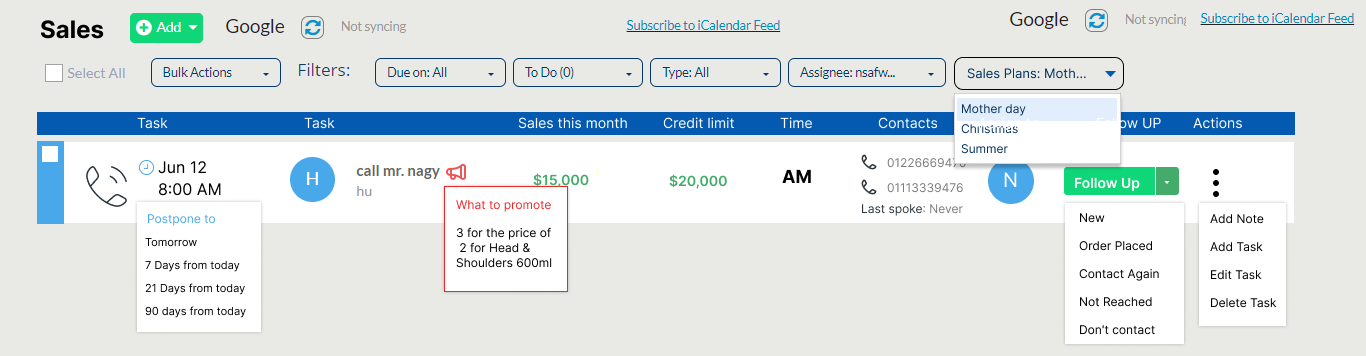 Per sales plan, to track your team performance and your coverage rate, per sales person and per task status